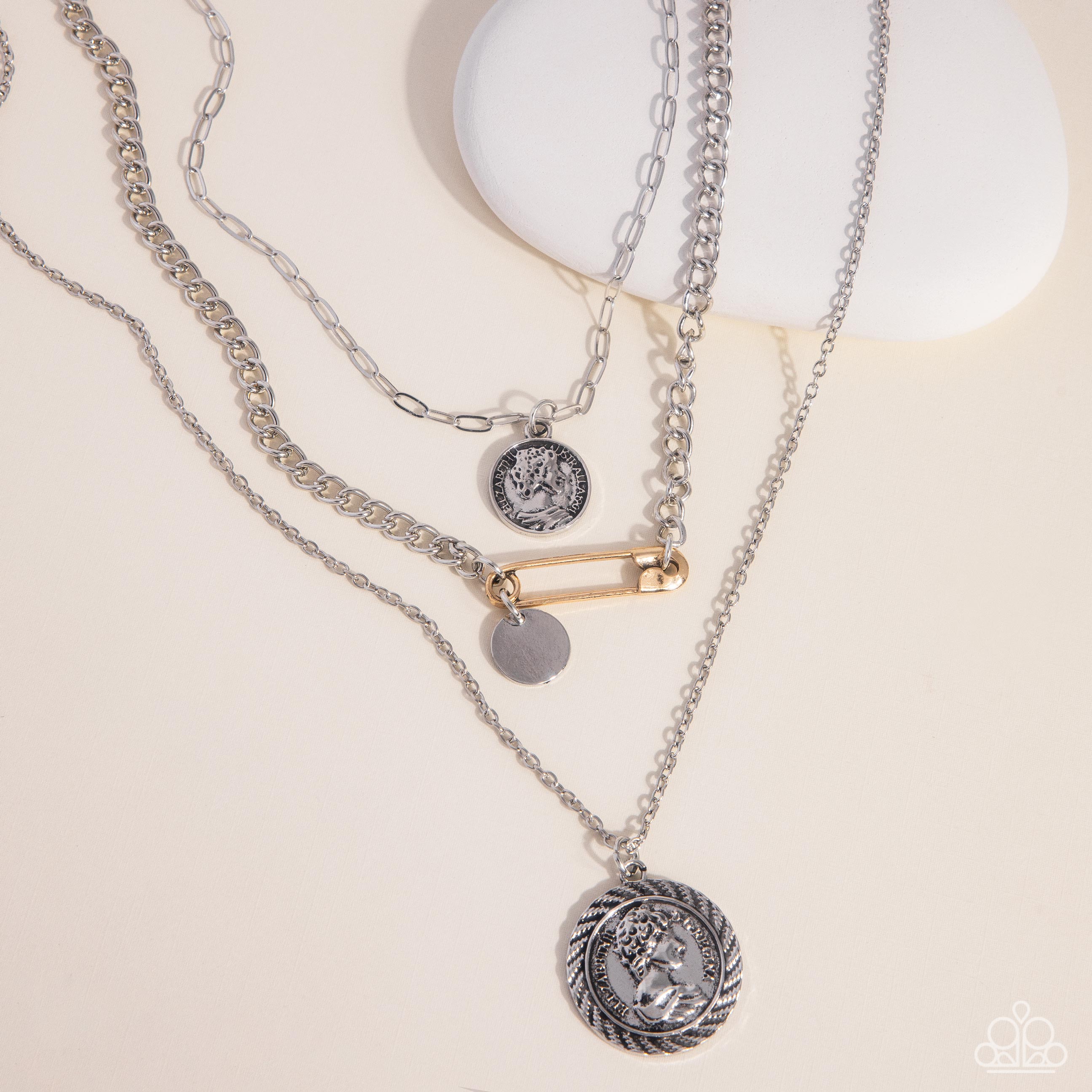Mismatched strands of silver paperclip, curb, and dainty cable chains coalesce in a layered display below the neckline. Silver coin-like pendants in varying sizes glide along the uppermost and lowermost chains while an antiqued gold safety pin connects the centermost chain with an additional silver disc for a vintage, one-of-a-kind look. Features an adjustable clasp closure.