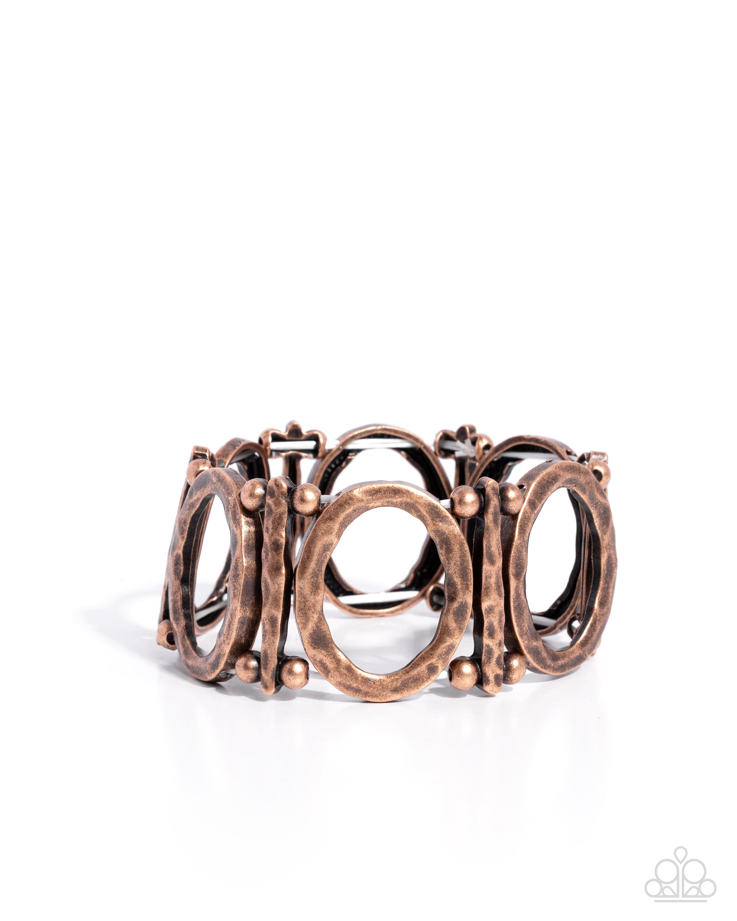Infused along elastic stretchy bands, a collection of hammered, thin copper bars alternate with copper hammered ovals between copper beads along the wrist for a whimsically weathered look.