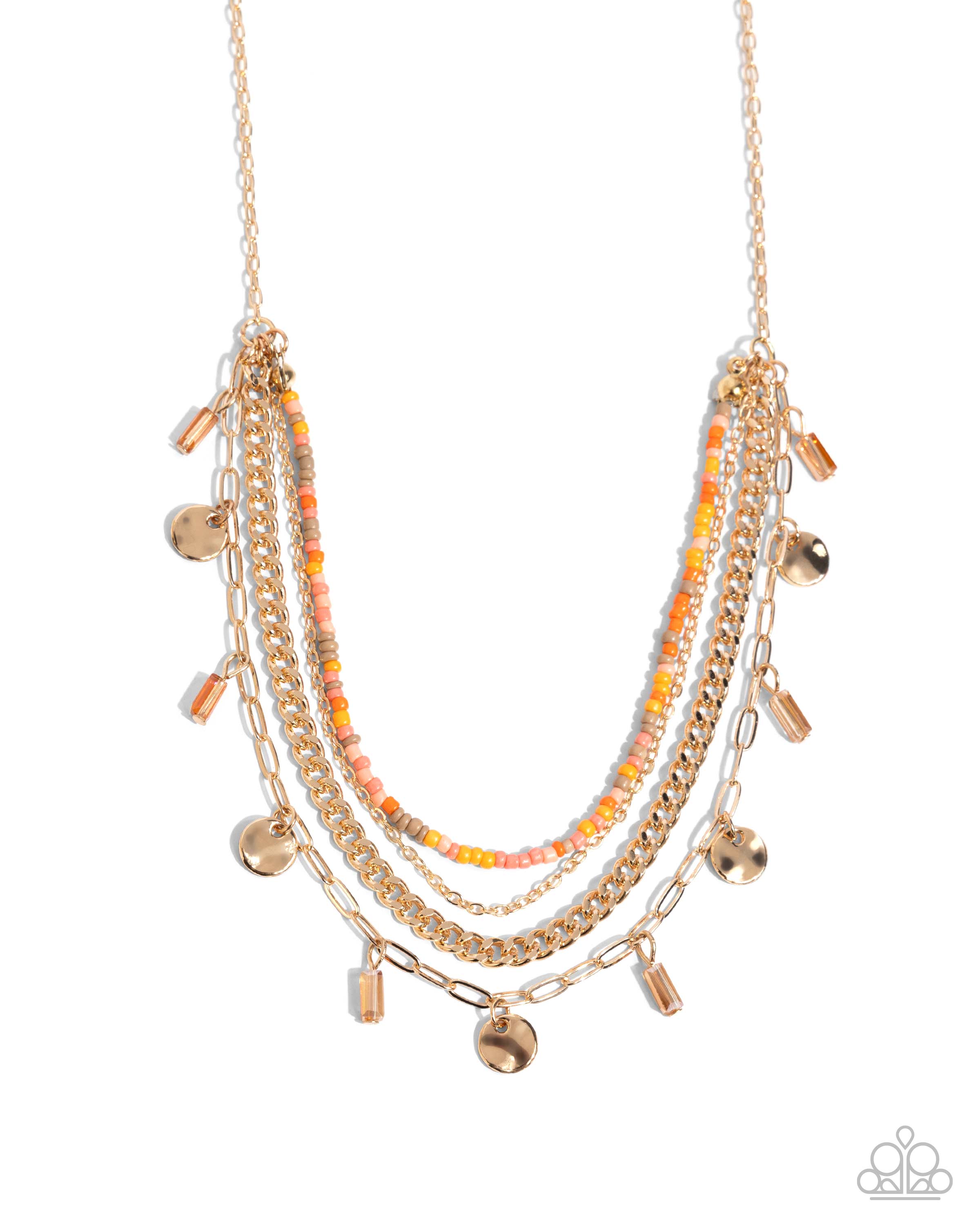 Featuring light peach, Brush, coral, and orange seed beads, a dainty gold chain, a gold curb chain, and hammered gold discs that alternate with cylindrical orange beads along a classic paperclip chain, mismatched gold chains layer below the collar from a solitaire dainty gold cable chain, creating a summery fringe below the collar. Features an adjustable clasp closure.