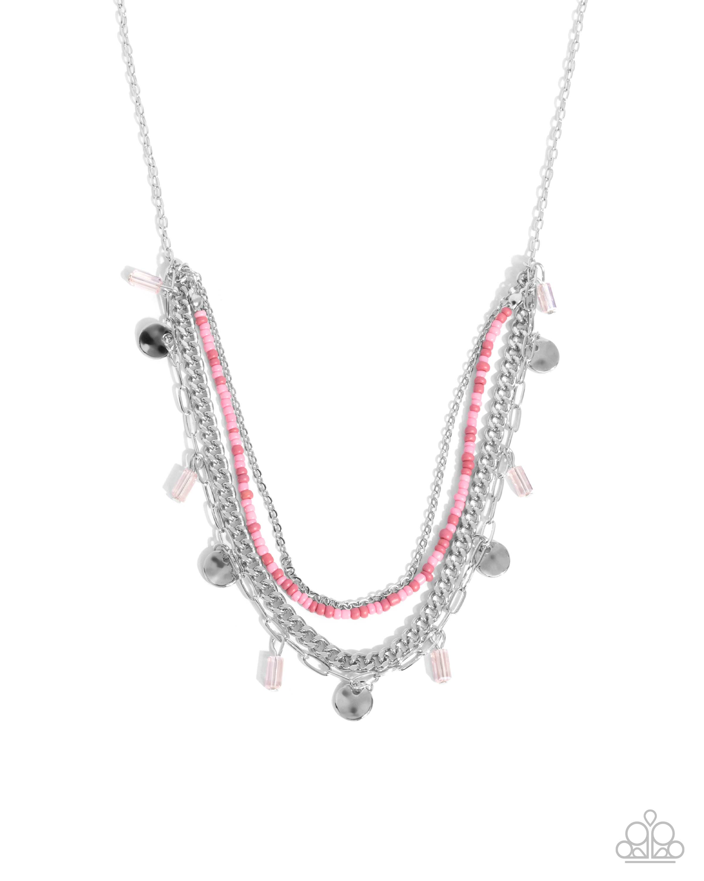 Featuring baby pink and Desert Rose seed beads, a dainty silver chain, a silver curb chain, and hammered silver discs that alternate with cylindrical light peach beads along a classic paperclip, mismatched silver chains layer below the collar from a solitaire dainty silver cable chain, creating a summery fringe below the collar. Features an adjustable clasp closure.