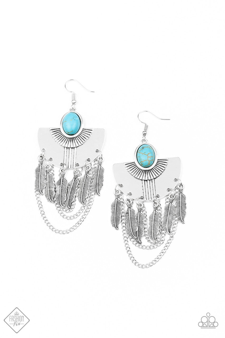 A fringe of antiqued silver feathers and shimmery silver chains swings from the bottom of a fanning silver frame dotted with a smooth turquoise stone for an earthy finish. Earring attaches to a standard fishhook fitting.