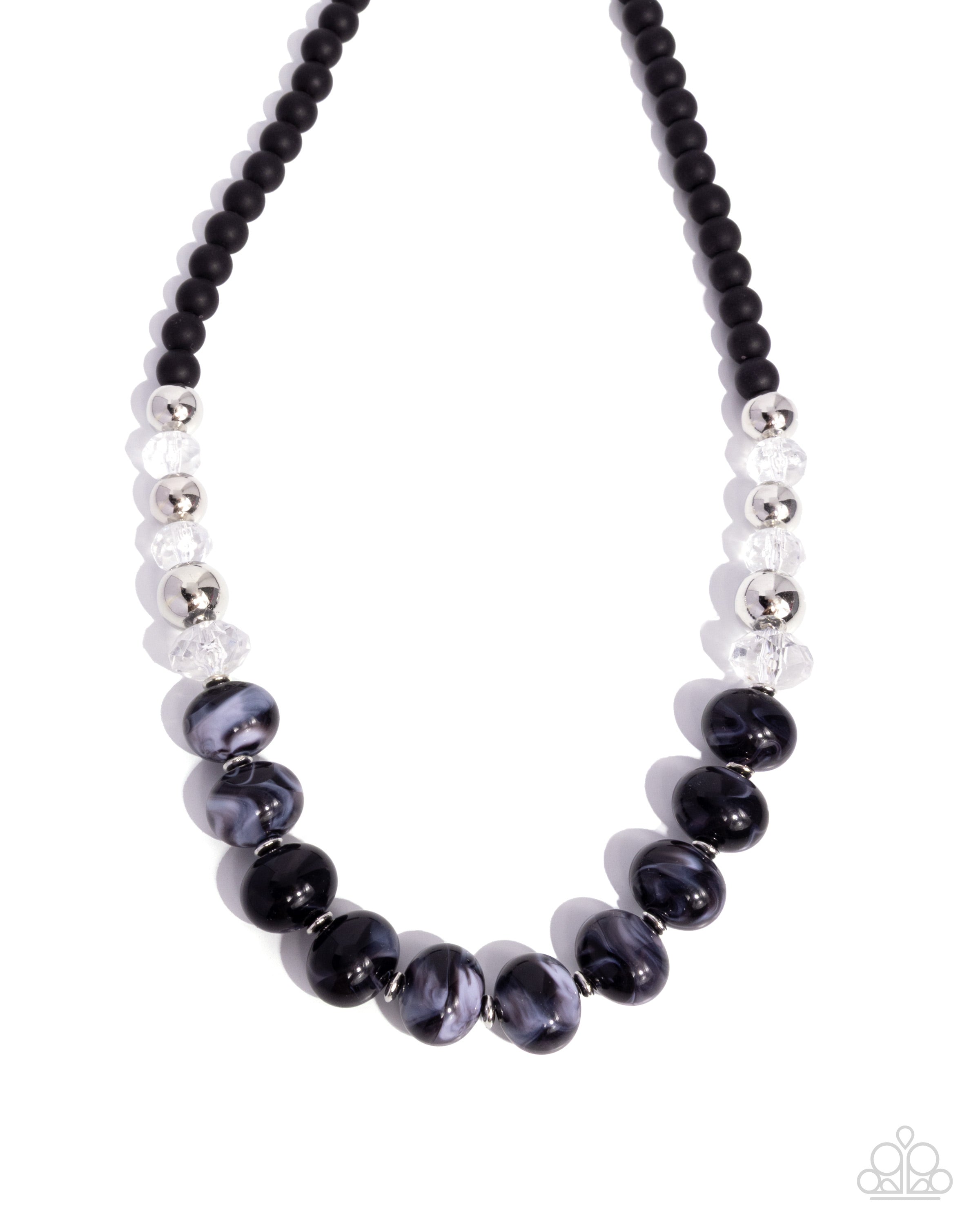 Infused along an invisible string, a collection of glossy silver beads, faceted clear beads, black-and-white-swirled acrylic beads, silver discs, and black matte beads pattern and coalesce below the neckline for an eye-catching, engaging display. Features an adjustable clasp closure.