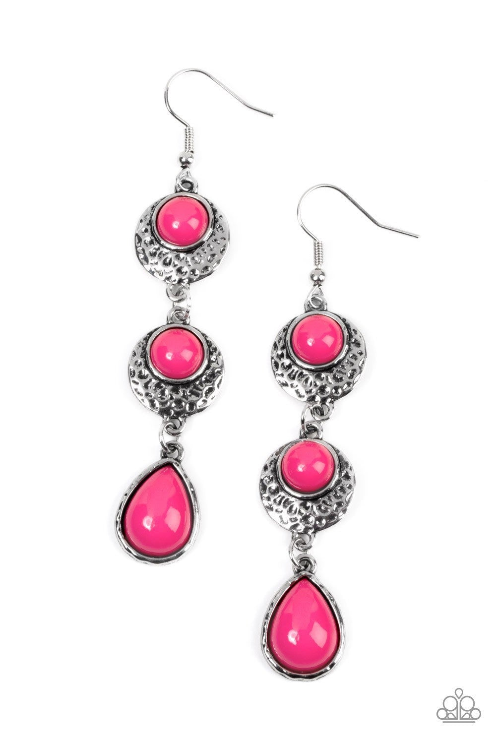 Tahoe Trailblazer - Pink - Teardrop Bead Hammered Silver Frame Paparazzi Fishhook Earrings