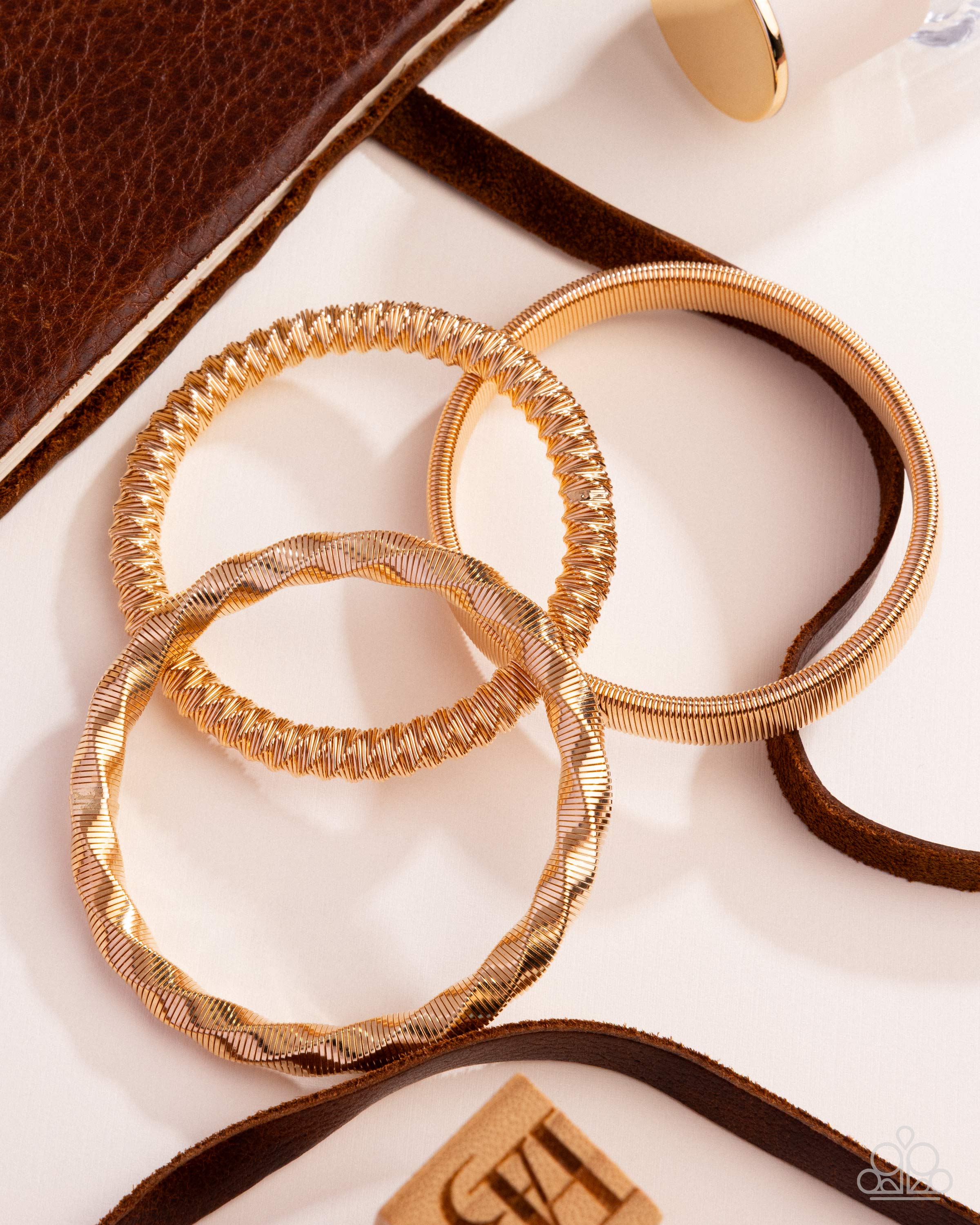 A trio of gold bands showcase three distinct textures, creating a dynamic yet cohesive design. The tightly coiled metallic links coil together and give a slight stretch.