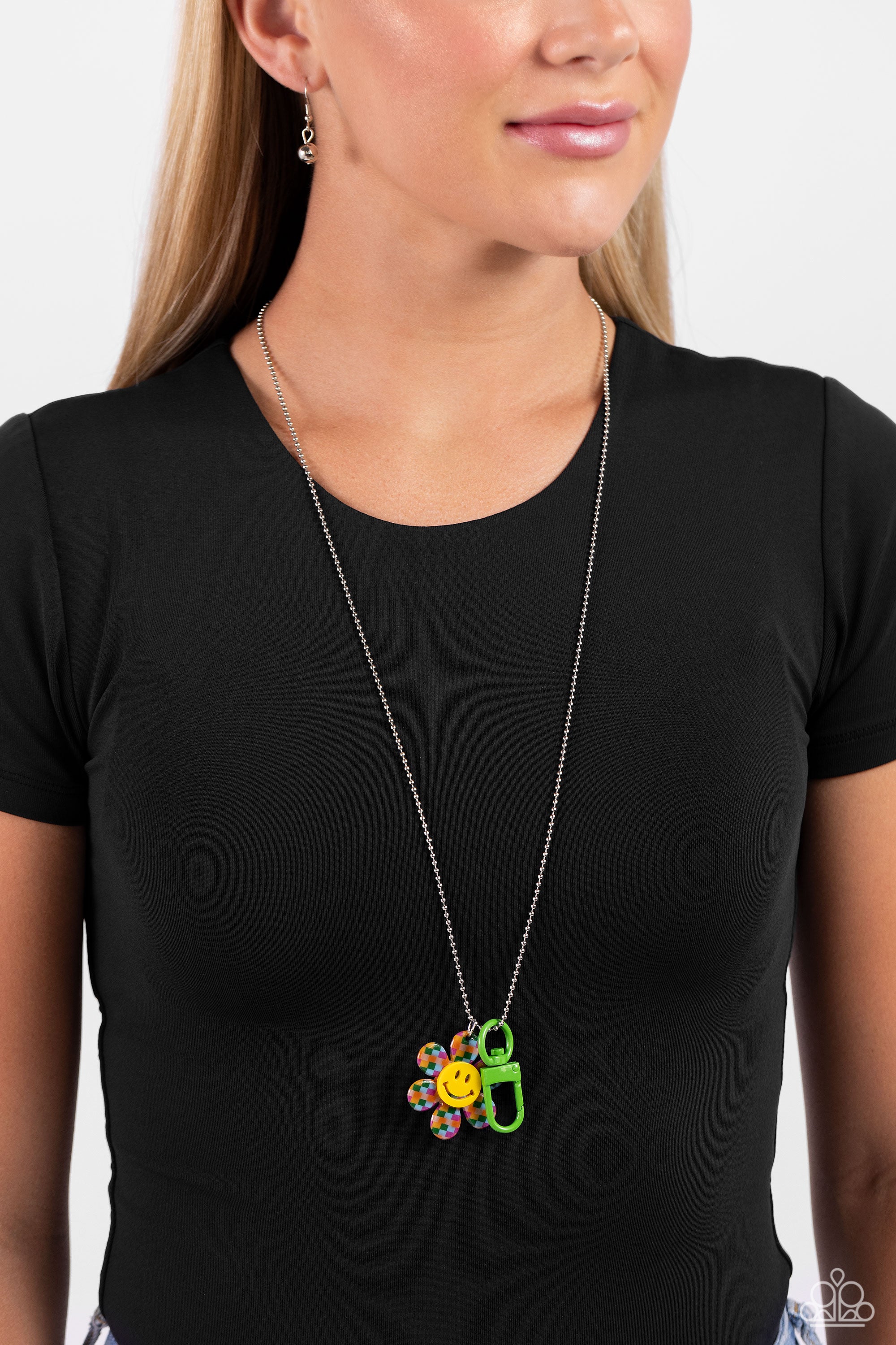 Radiating with a multicolored checkerboard pattern, a yellow smiley face floral frame swings next to a Classic Green lanyard hook from an elongated silver ball chain, creating an optimistic-inspired statement below the collar. A lobster clasp hangs from the bottom of the design to allow a name badge or other item to be attached. Features an adjustable clasp closure.