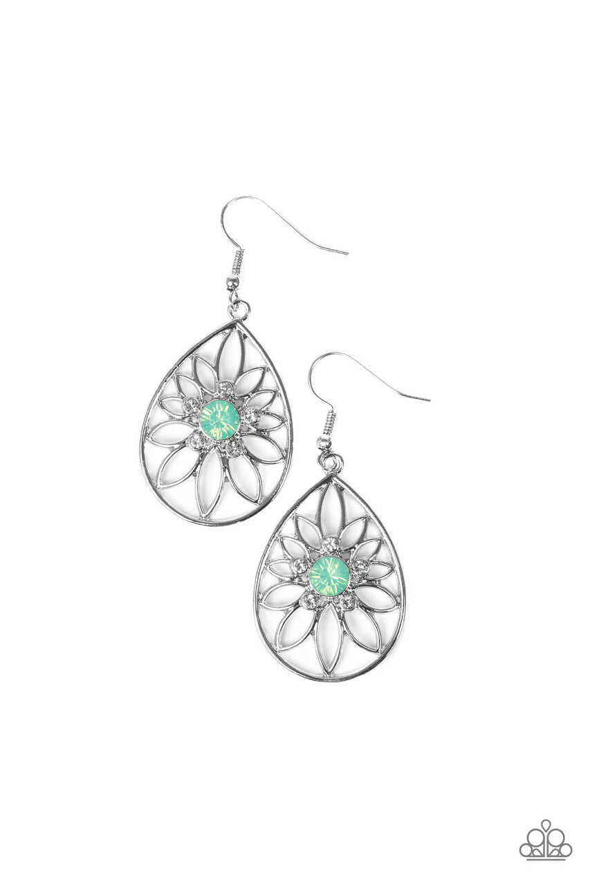Infused with a ring of glittery white rhinestones, an opaque green rhinestone is pressed into the center of a shimmery silver teardrop radiating with floral petals for a whimsical look. Earring attaches to a standard fishhook fitting.