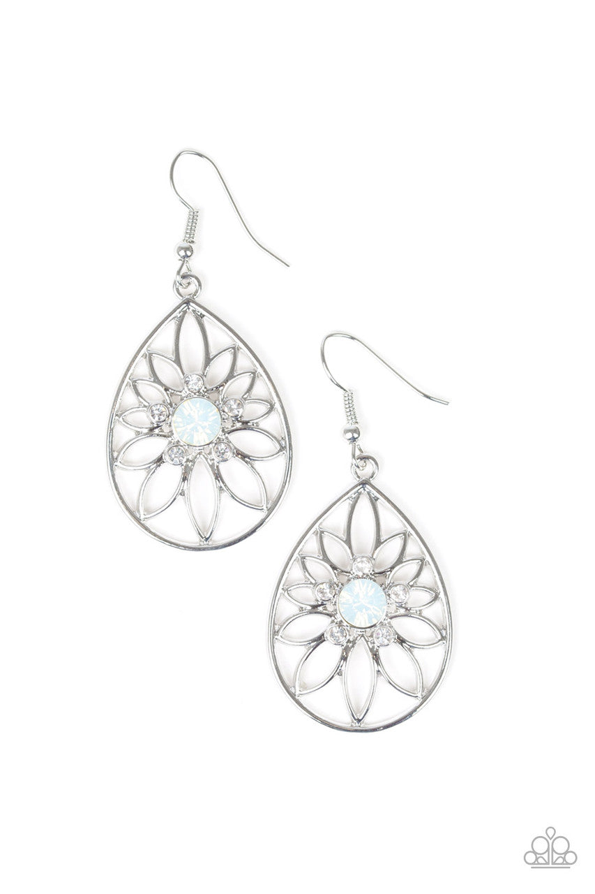 Infused with a ring of glittery white rhinestones, an opaque white rhinestone is pressed into the center of a shimmery silver teardrop radiating with floral petals for a whimsical look. Earring attaches to a standard fishhook fitting.