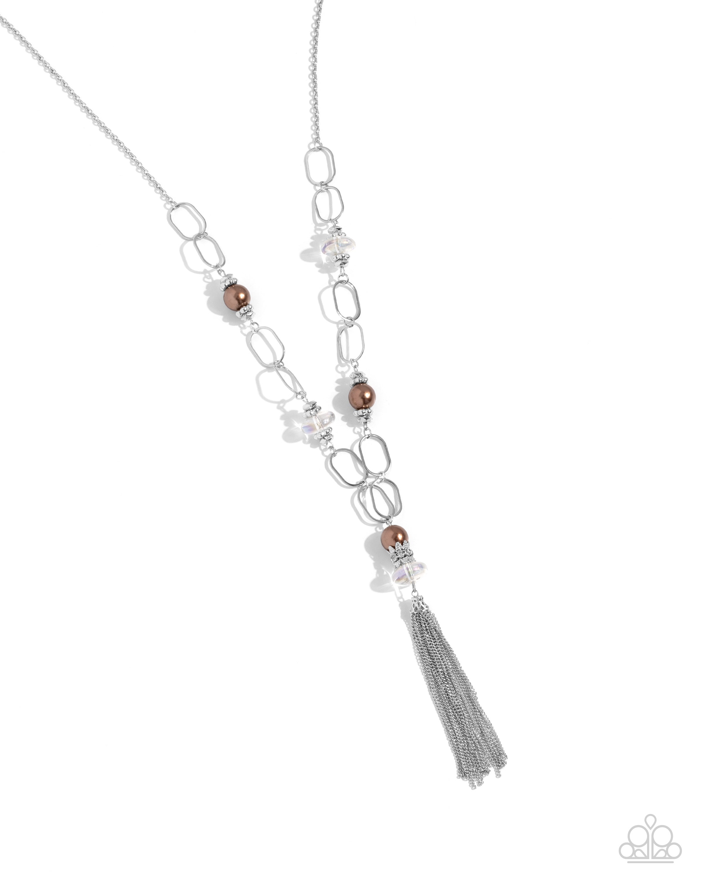 Infused with faceted and studded silver accents, iridescent beads and oversized brown pearls connect with sections of oversized silver hoops across the chest. Enhanced with matching beaded accents, a shimmery silver tassel swings from the bottom for a romantic finish. Features an adjustable clasp closure.