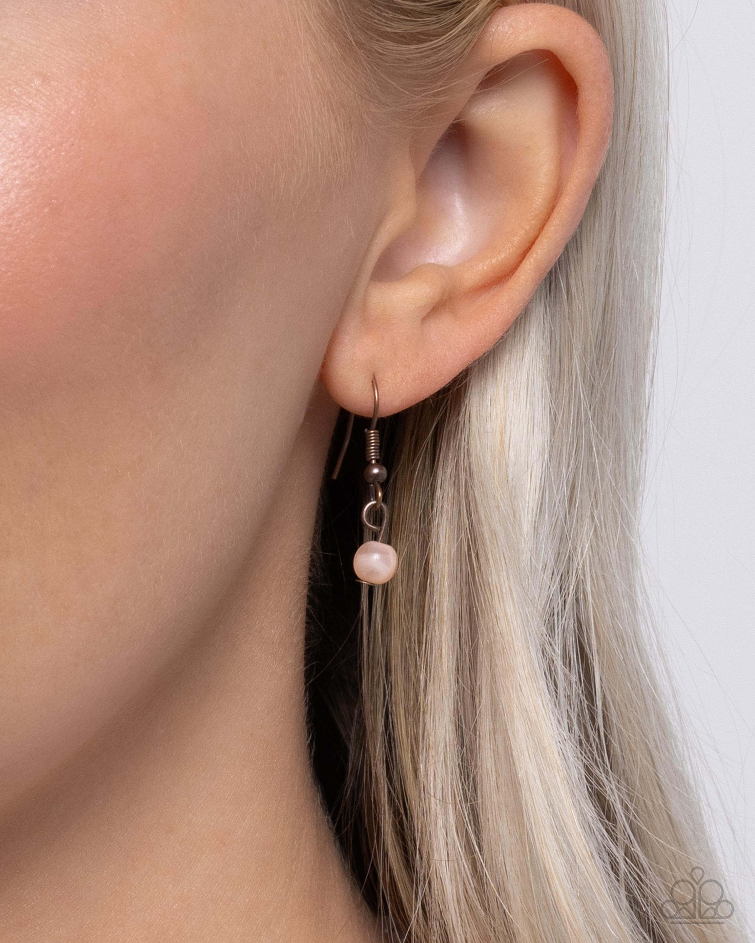 Infused along an invisible string, a collection of cloudy light peach acrylic beads cascades below the neckline. Featuring a stamped floral motif, a textured copper heart pendant is suspended below a peach string bow that sways below the peachy beaded chain for a flourishing, whimsical finish. Features an adjustable clasp closure.