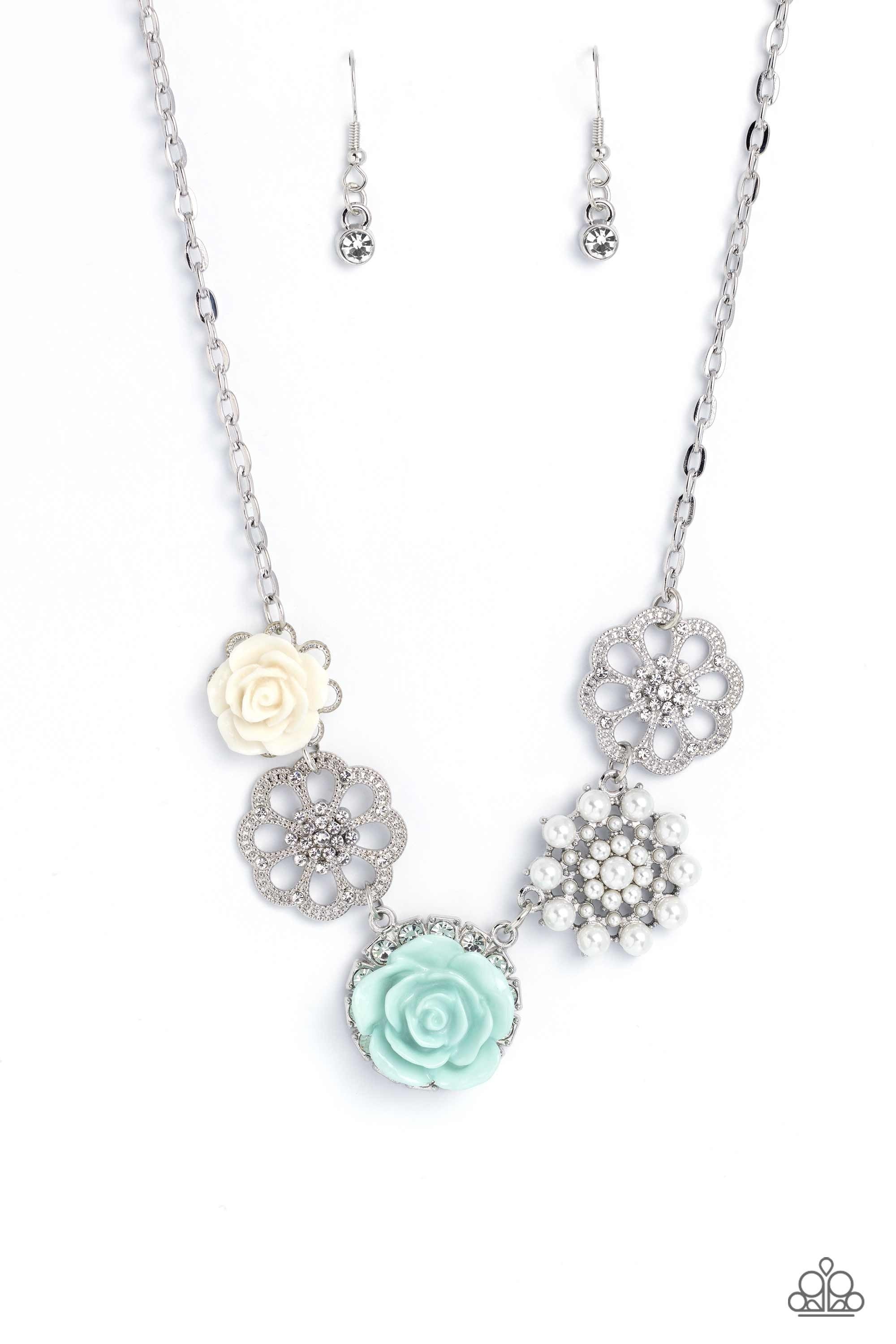 A collection of whimsical, refined flowers gathers along a flat, sleek silver link chain. The featured charms include an ivory resin rose blooming atop a glittery silver floral silhouette, two silver flowers dusted with dainty white rhinestones and studs around its petals and centers, a Skylight resin rose blooming atop a fan of white gems, and a pearl-petaled and centered flower creating a floral fantasy around the collar. Features an adjustable clasp closure.