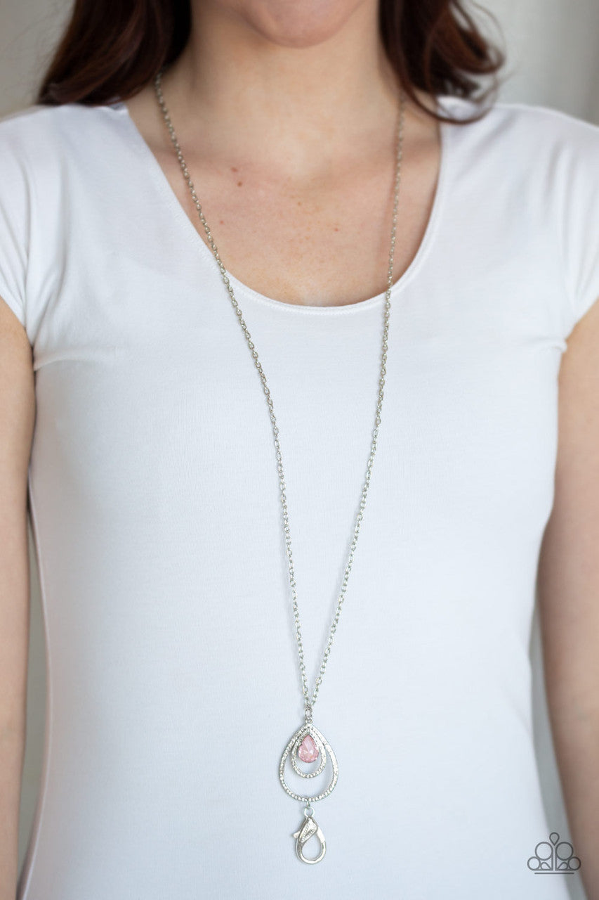 White rhinestone encrusted teardrop frames ripple from the bottom of a pink teardrop gem, creating a timelessly stacked pendant at the bottom of a lengthened silver chain. A lobster clasp hangs from the bottom of the design to allow a name badge or other item to be attached. Features an adjustable clasp closure.