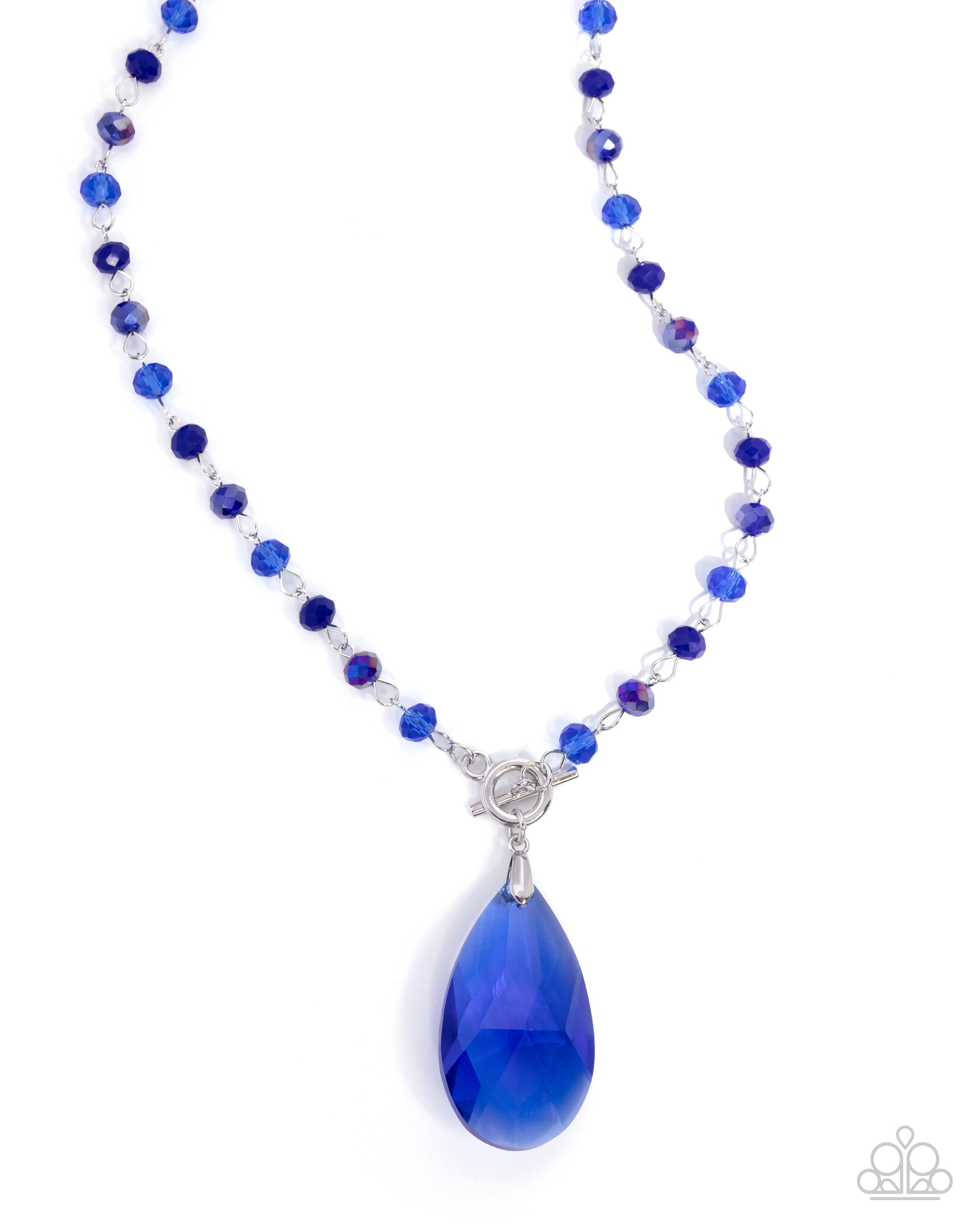 Infused along a classic silver chain, faceted blue and dark blue gems alternate and cascade below the neckline, leading the eye to an oversized blue teardrop gem, creating a radiantly refined look fit for royalty. Features an adjustable clasp closure.
