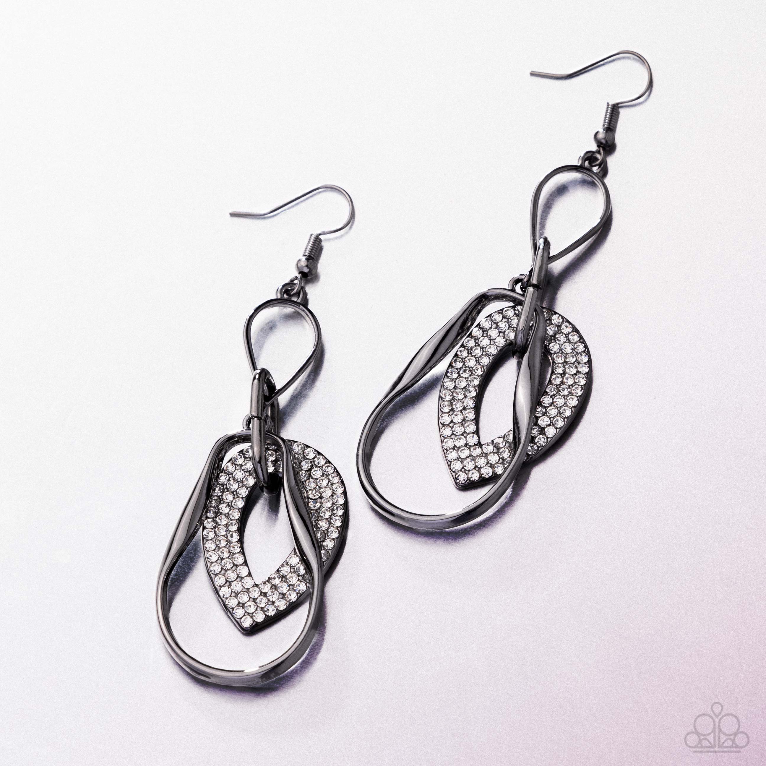 A cascade of interlocking gunmetal frames layers into an abstract chandelier. One sleek gunmetal teardrop is encrusted in rows of dainty white rhinestones, adding a glittery element to the asymmetrical display. Earring attaches to a standard fishhook fitting.
