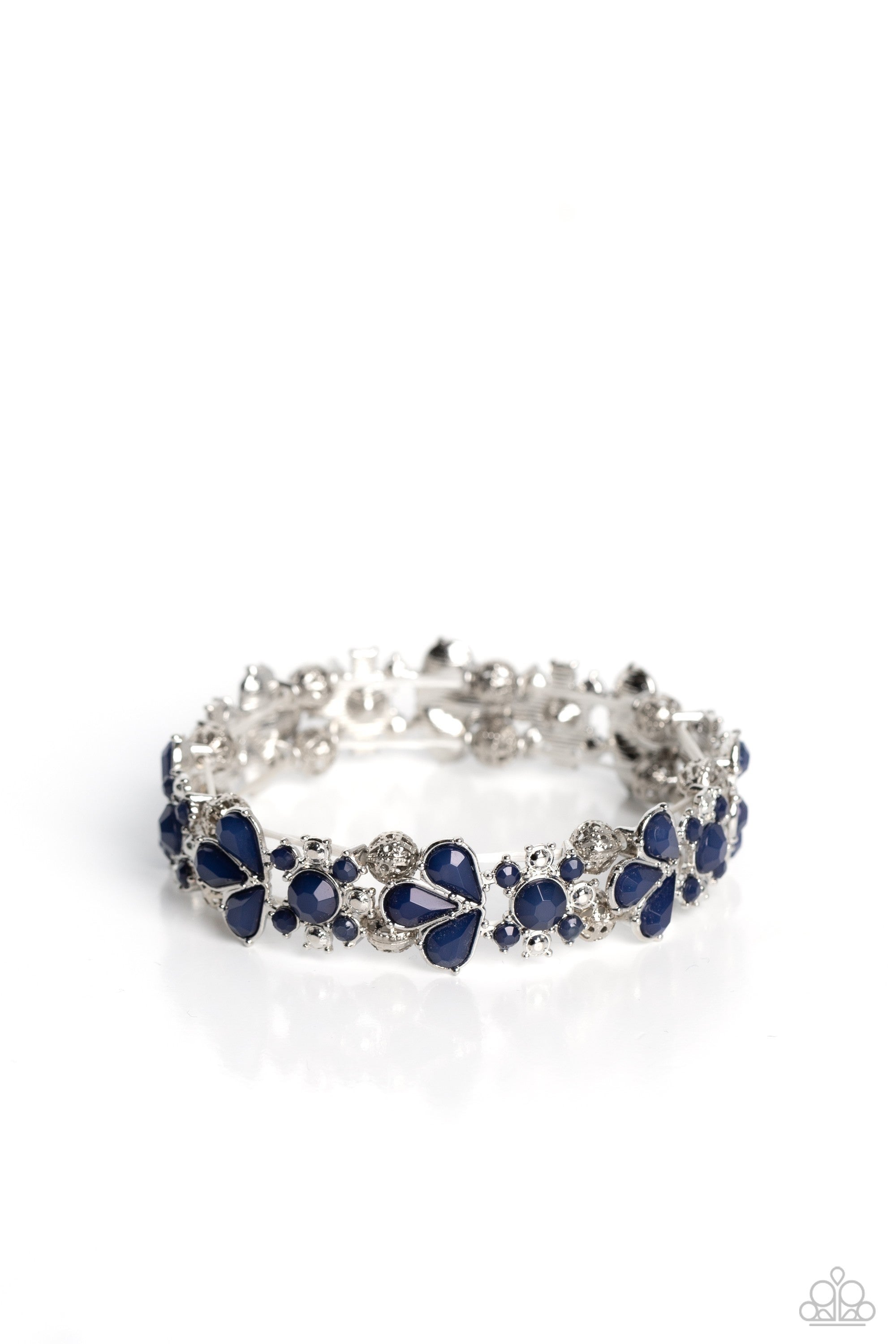 A flourishing collection of Midnight round, and teardrop beads coalesce into abstract floral-inspired frames. Separating each floral frame, airy, silver-studded beads are infused along elastic stretchy bands, creating a dash of shimmer to the whimsically colorful design around the wrist.