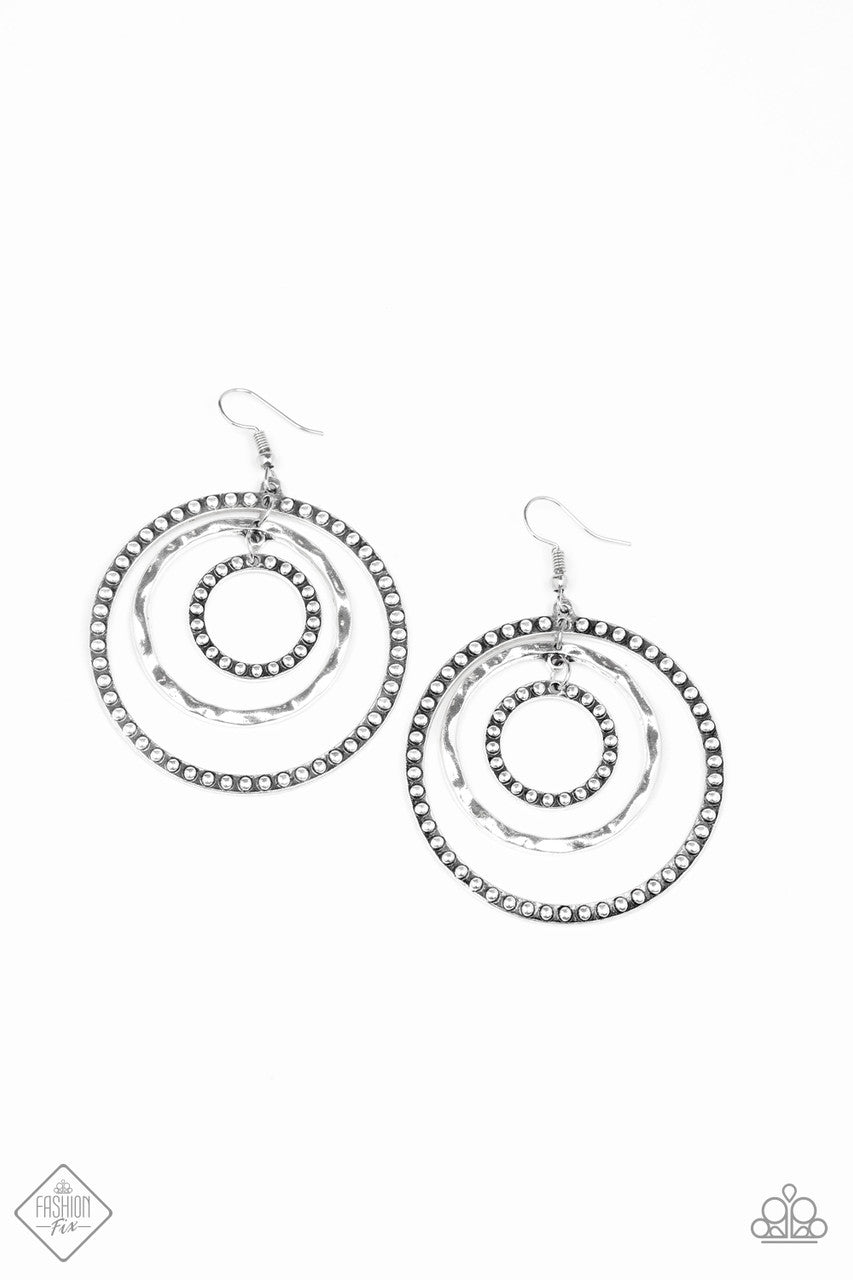 Studded and hammered silver hoops alternate into a rippling rustic hoop. Earring attaches to a standard fishhook fitting.