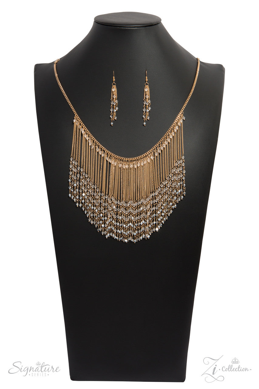 Countless gold chains stream from the bottom of a glistening gold chain, creating a curtain of show-stopping fringe that falls just below the collar. Faceted crystal-like beading lays across the top of the cascading chains, while even more crystal beading drips from the bottom of each strand. A collection of crystal-like beads brushed in a subtle metallic finish fall along the tapered edge of the golden fringe for a jaw-dropping finale. Features an adjustable clasp closure.