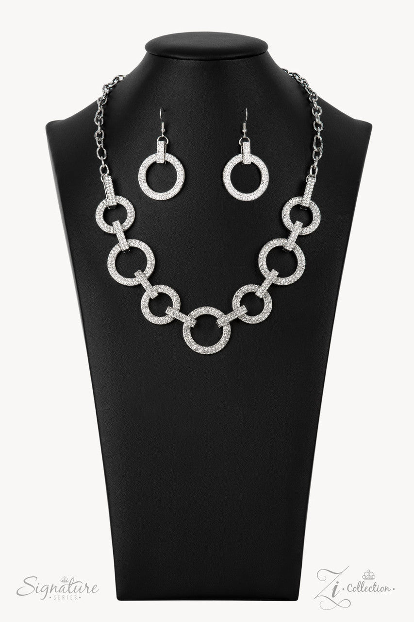 Elegantly enhanced with white rhinestone encrusted links, an effervescent array of white rhinestone encrusted silver hoops glamorously alternate below the collar for an unapologetically audacious sparkle. Features an adjustable clasp closure.