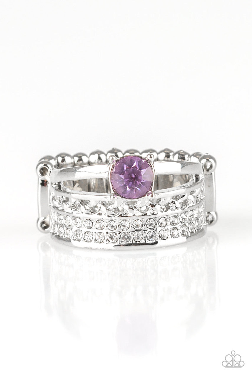 A white rhinestone encrusted, decorative silver, and shiny silver band stack across the finger. A glittery purple rhinestone crowns the uppermost band for a regal finish. Features a stretchy band for a flexible fit.