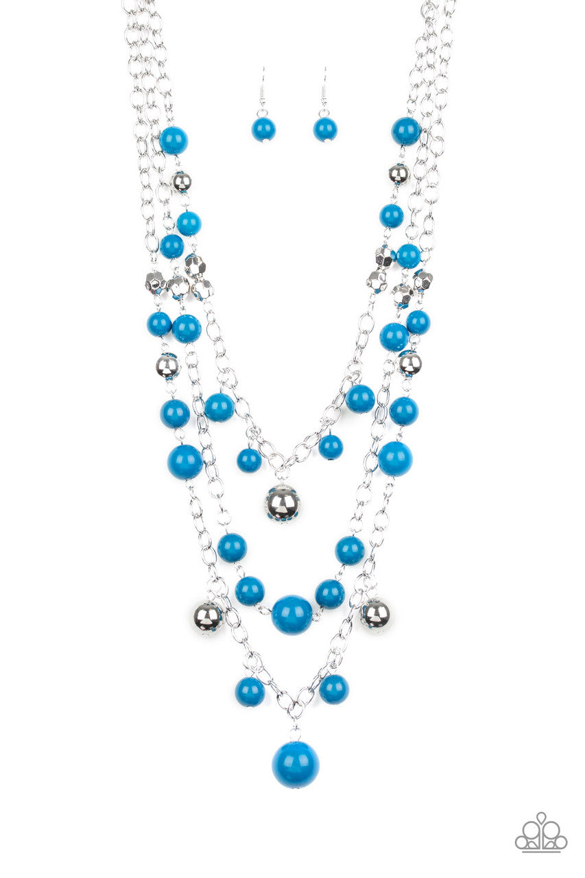 An assortment of shiny silver, faceted silver, and refreshing blue beads sporadically dot and swing from three shimmery silver chains that layer down the chest for a colorful statement-making finish. Features an adjustable clasp closure.