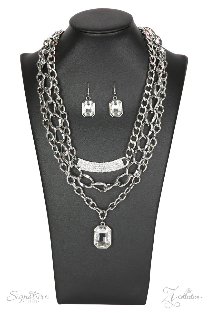 A large emerald-cut rhinestone drips below a mashup of oversized silver chains, creating a beautiful contrast of industrial edge and timeless sparkle. A bowing silver bar encrusted in dazzling white rhinestones adorns the topmost silver chain, adding blinding shimmer to the glitzy design. Features an adjustable clasp closure.