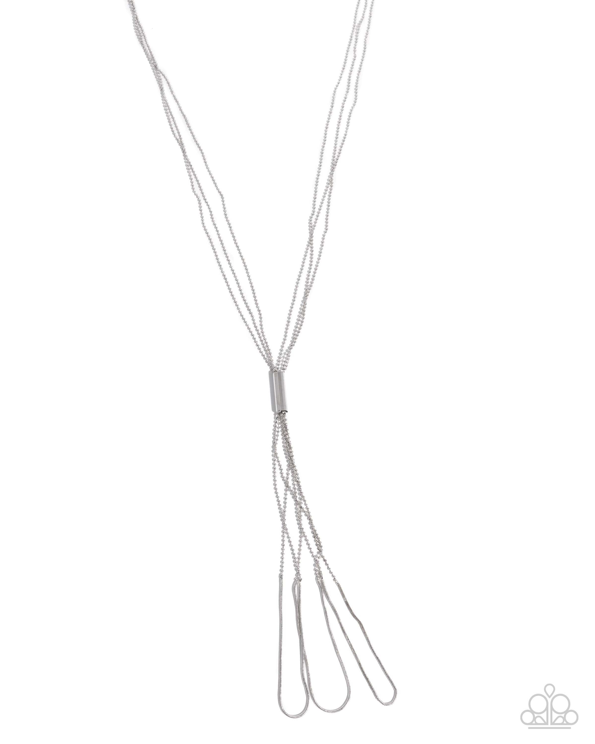 A collection of delicate silver ball chains cascades into a dramatic Y-shaped silhouette. A sleek cylindrical accent gathers the chains at the center, allowing them to flow into striking snake chain loops at the bottom. Features an adjustable clasp closure.