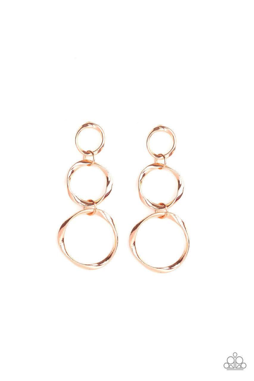Brushed in a high sheen finish, asymmetrical shiny copper rings gradually increase in size as they cascade from the ear for a refined flair. Earring attaches to a standard post fitting.