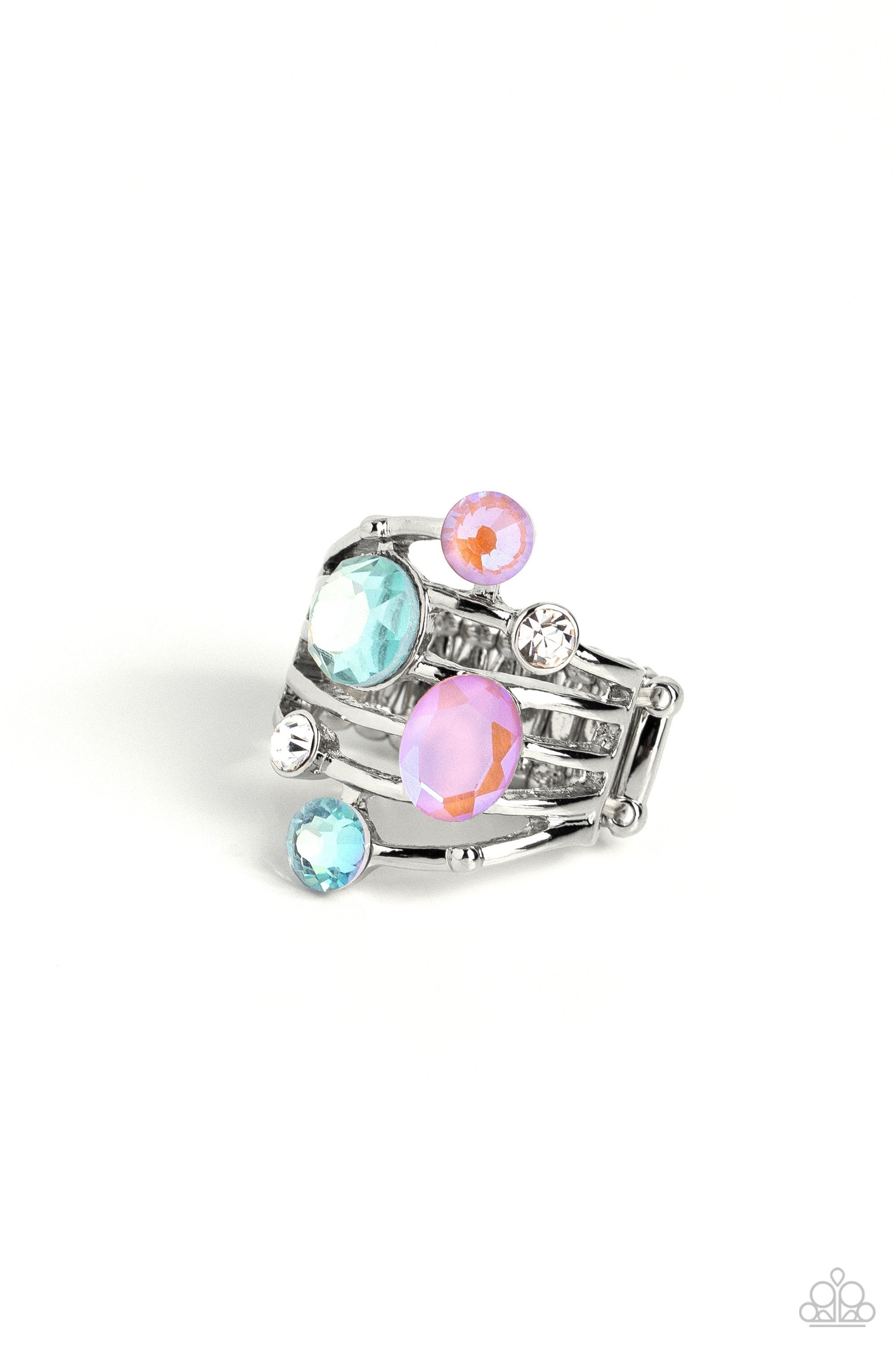 Featuring a refined sheen, smooth silver bars arc across the finger, creating an airy band. Glittery blue, peach that fades to purple, and white rhinestones of various sizes and shapes are sprinkled haphazardly across the glistening bands, adding an asymmetrical sparkle to the collision of metallic textures. Features a stretchy band for a flexible fit. Due to its prismatic palette, color may vary.