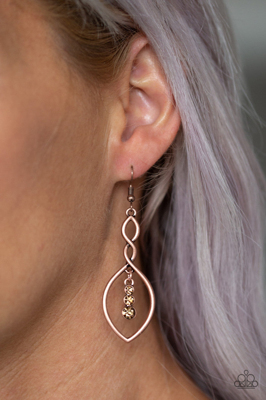 A glistening copper ribbon twists into an elegant lure. Gradually increasing in size, a trio of golden topaz rhinestones swing from the top of the frame for a dazzling finish. Earring attaches to a standard fishhook fitting.