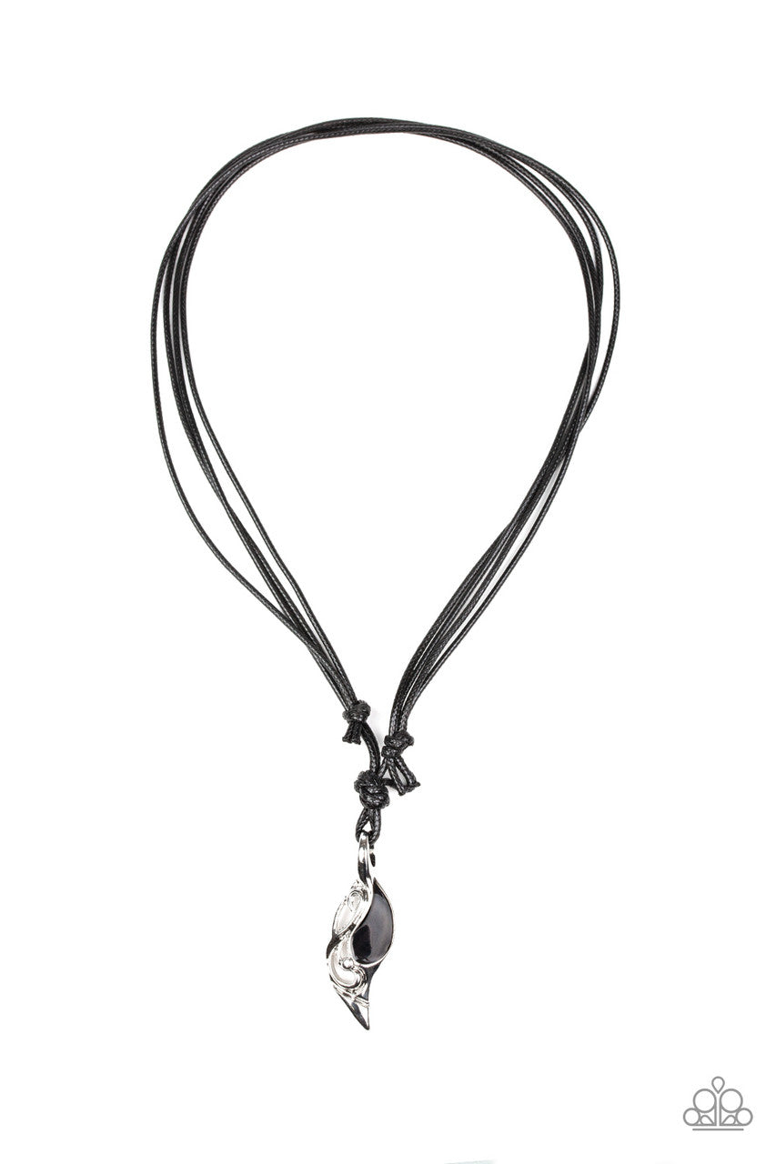 Featuring a shiny black accent, a leafy silver pendant is knotted in place along shiny black cording for an urban look. Features an adjustable sliding knot closure.