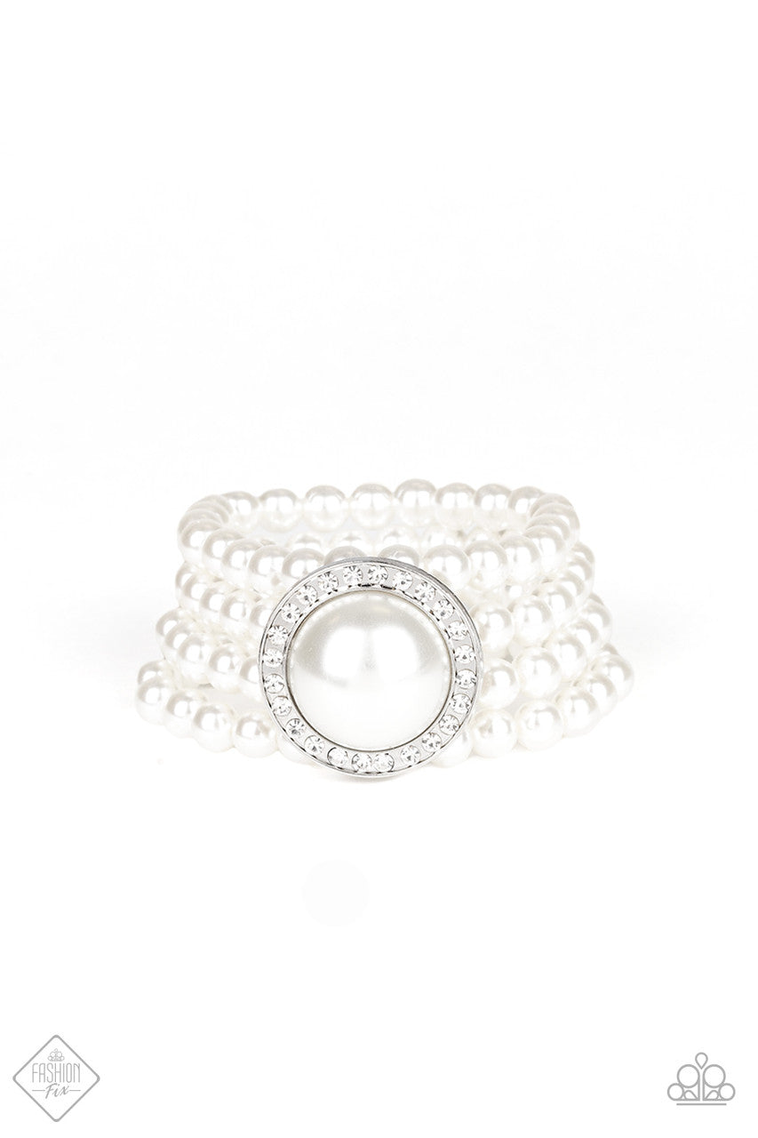Threaded along stretchy bands, four strands of pearly white beads are held in place by an exaggerated pearl bead encased in a frame of glassy white rhinestones for a vintage-inspired finish.