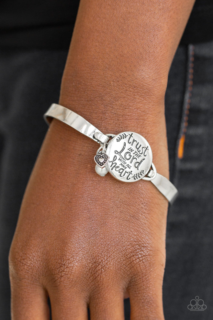 Infused with a classic white pearl and dainty silver heart charm, shiny silver bars curl around the wrist and attach to a round centerpiece stamped in the inspiration phrase, "Trust In The Lord With All Your Heart". Features a hinged closure.