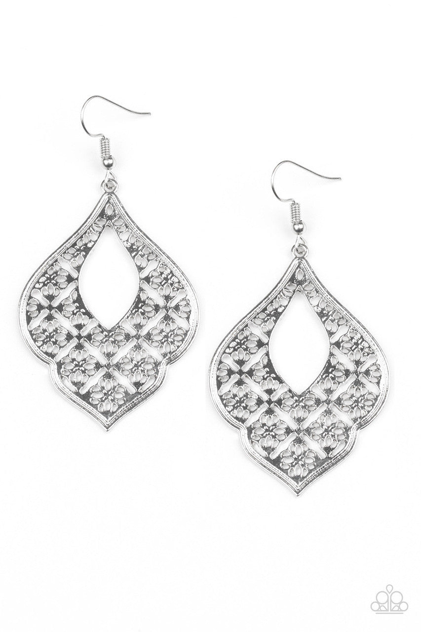 Filled with floral filigree details, a scalloped silver lure swings from the ear for a whimsical look. Earring attaches to a standard fishhook fitting.