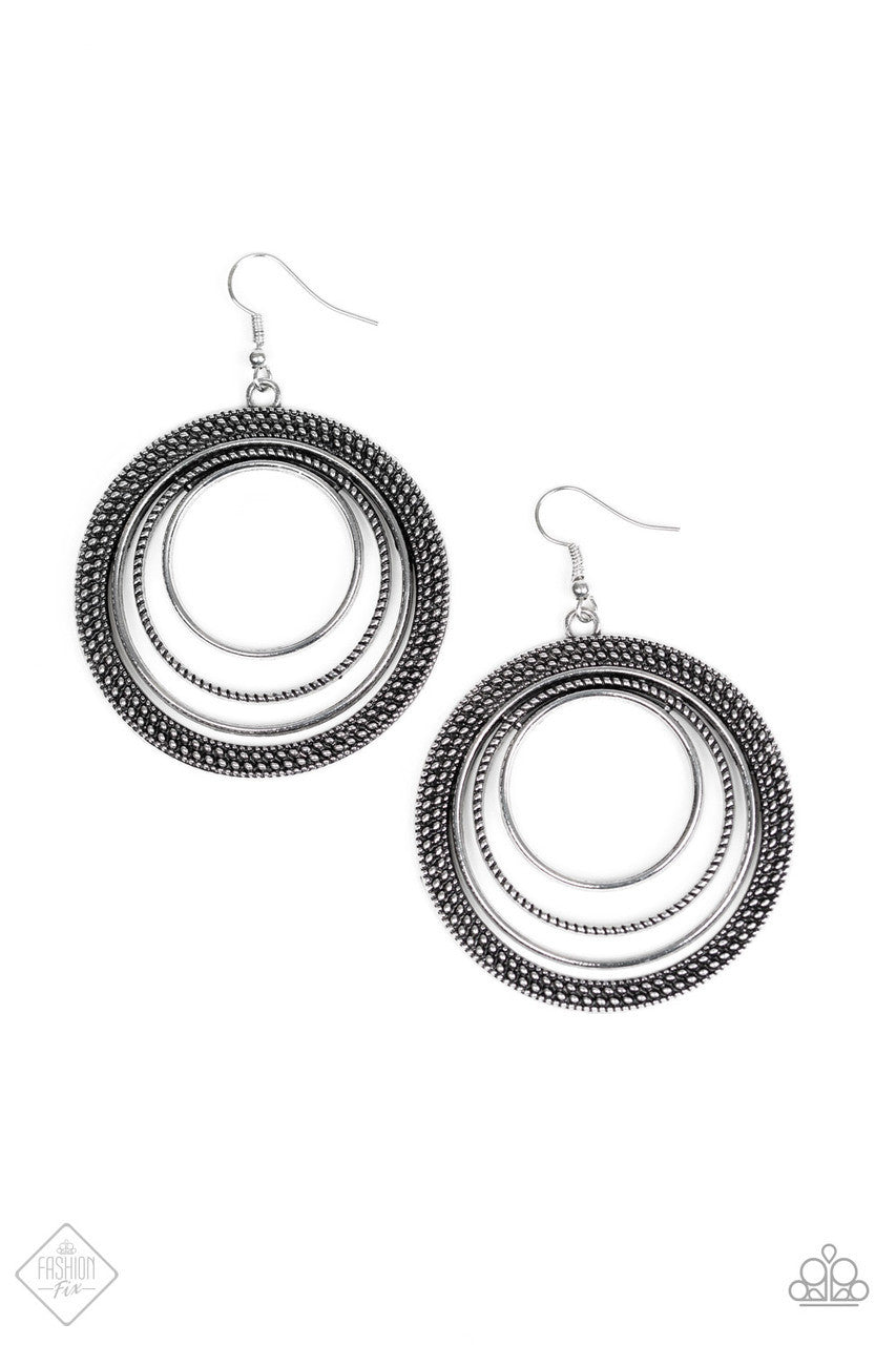 Radiating with smooth, studded, and rope-like textures, a collection of silver hoops ripple into a bold statement piece. Earring attaches to a standard fishhook fitting.