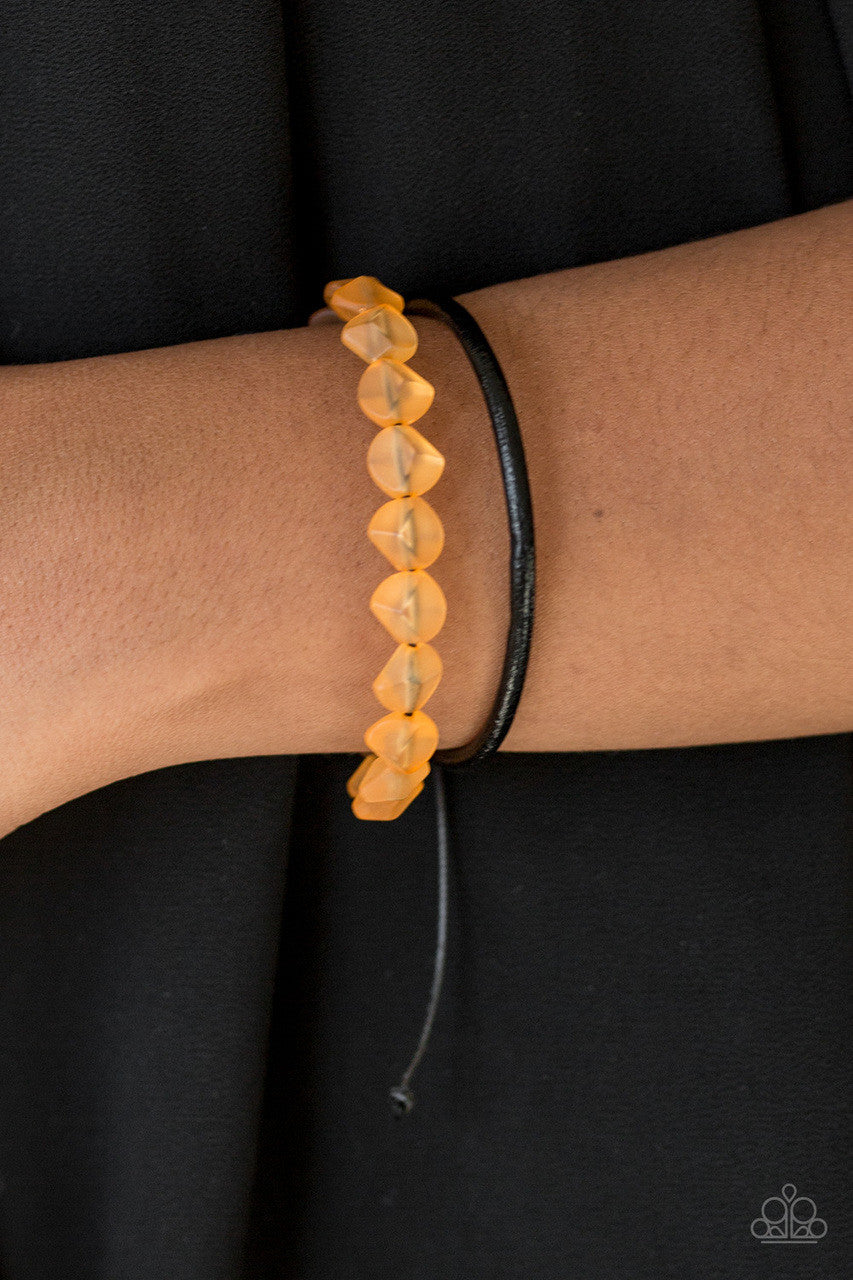 Featuring an opaque finish, a strand of faceted orange beads and a strand of shiny leather cording wrap around the wrist, creating dainty layers. Features an adjustable sliding knot closure.
