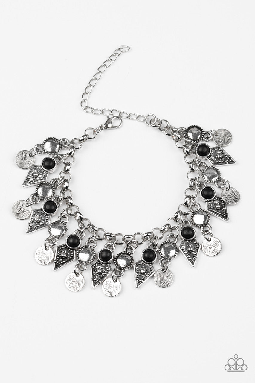 Featuring studded detail and smooth black stone accents, mismatched silver frames swing from the bottom of a bold silver chain, creating a flirty fringe around the wrist. Features an adjustable clasp closure.