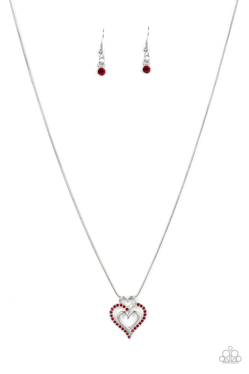 A red rhinestone encrusted heart intertwines with two plain silver heart frames, stacking into a romantic pendant at the bottom of a sleek silver chain. Features an adjustable clasp closure.